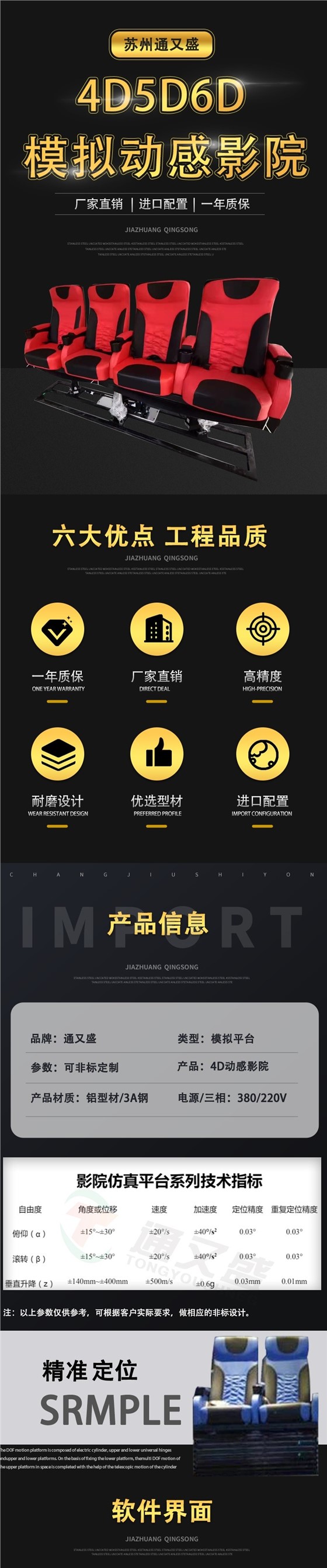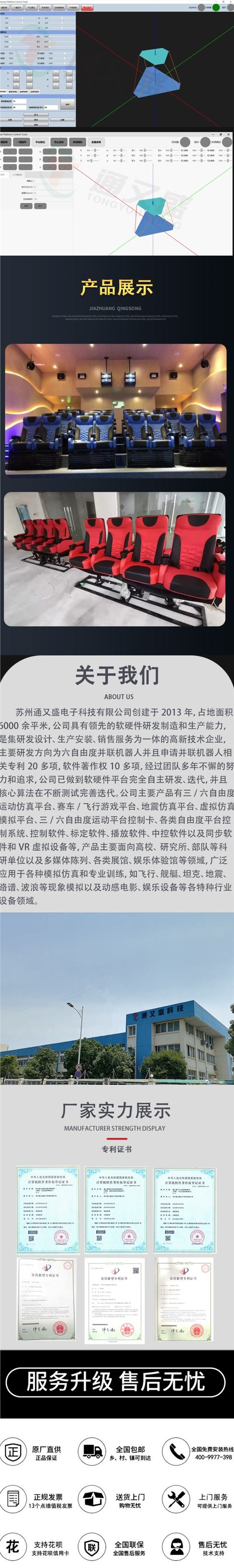 三自由度运动平台是由电动缸,上、下万向铰链和上、下两个平台组成,下平台固定的基础上,借助电动缸伸缩运动,完成上平台在空间多自由度运动,从而可以模拟出各种空间运动姿态,可广泛应用到各种训练模拟器中,如飞行模拟器、汽车驾驶模拟器、地震模拟器以及动感电影、娱乐设备等领域中。