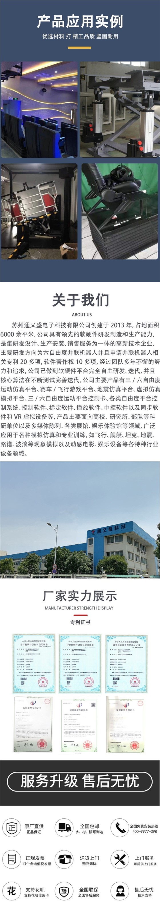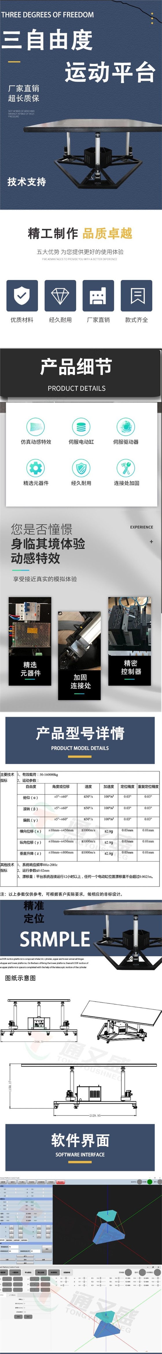 三自由度运动平台是由电动缸,上、下万向铰链和上、下两个平台组成,下平台固定的基础上,借助电动缸伸缩运动,完成上平台在空间多自由度运动,从而可以模拟出各种空间运动姿态,可广泛应用到各种训练模拟器中,如飞行模拟器、汽车驾驶模拟器、地震模拟器以及动感电影、娱乐设备等领域中。