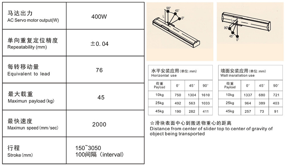 马达出力:400W 单向重复定位精度:±0.04mm 每转移动量:76mm 最快速度:2000mm/s 查看详情